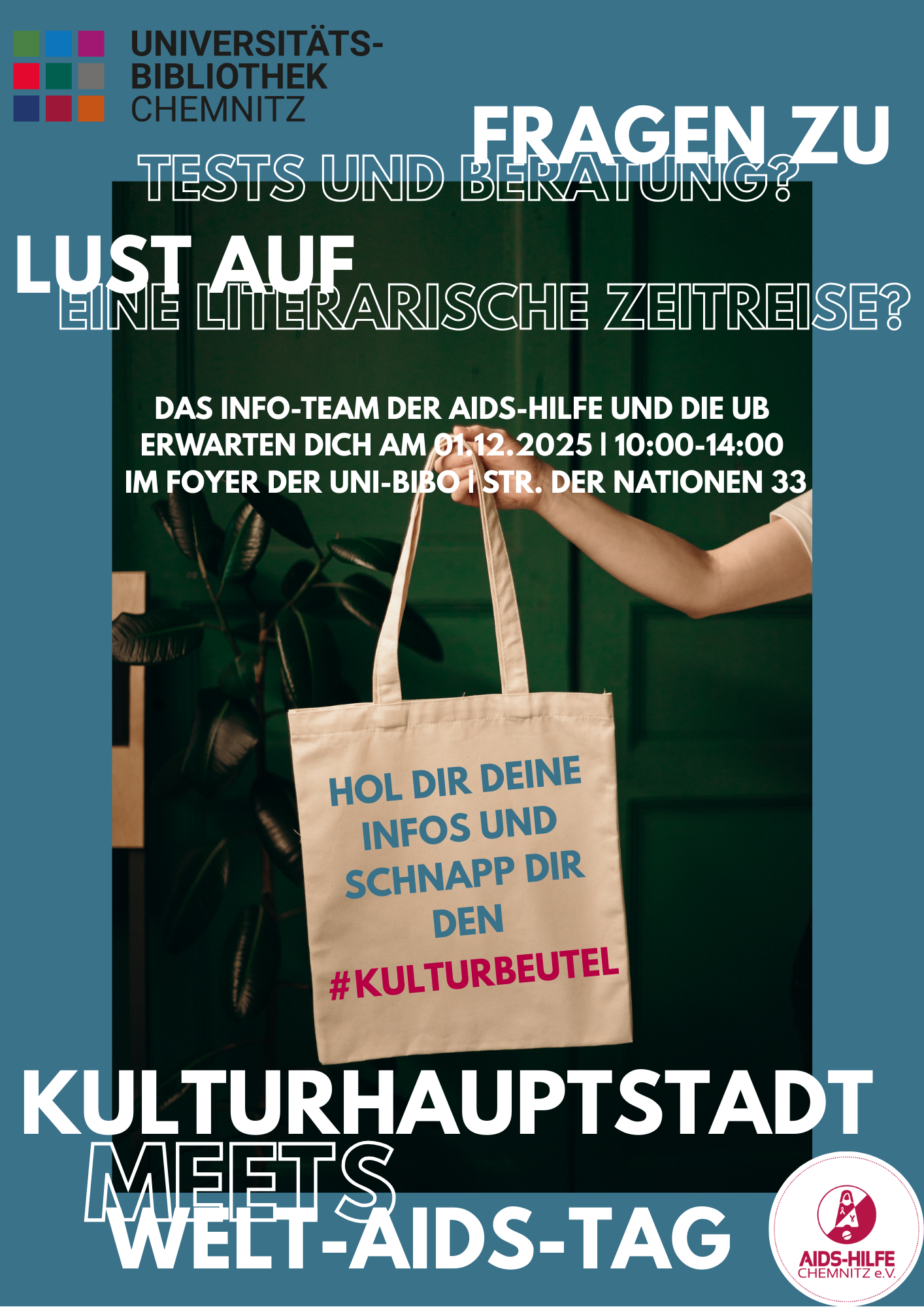Anlässlich des Welt-Aids-Tages erwarten dich unser Info-Team und die Mitarbeiter*innen der Universitätsbibliothek am 01.12.2025 von 10:00 bis 14:00 Uhr im Foyer der Uni-Bibo auf der Straße der Nationen. Wir stehen dir Rede und Antwort zu allen Fragen rund um unsere Arbeit und haben tolle Give-Aways für dich vorbereitet.