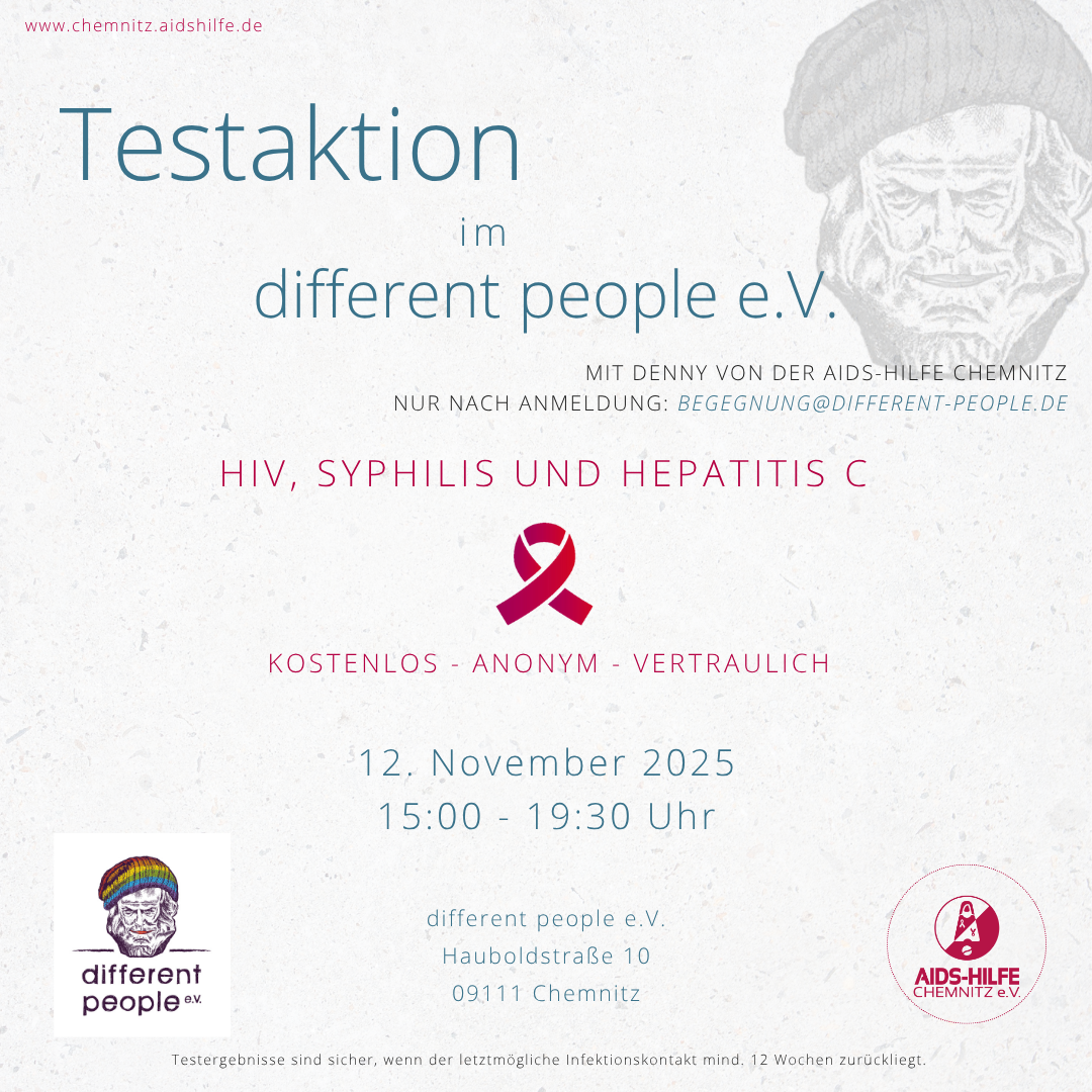 Am 12.11.2025 von 15:00 bis 19:30 Uhr im different people e.V. auf der Hauboldstraße 10 in Chemnitz.